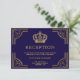 Cartão de recepção elegante com uma borda ornamentada dourada e uma bela coroa contra um fundo azul escuro.