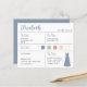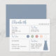 Um cartão de informação de dama de honra azul empoeirado, incluindo informações sobre a data e local do casamento, as cores do casamento, o vestido da dama de honra e uma mensagem de convite para ser dama de honra. No canto superior esquerdo, o nome da dama de honra está escrito em uma caligrafia azul empoeirada. No canto inferior direito, há um vestido azul empoeirado. No centro, estão as cores do casamento em círculos. As cores, incluindo a cor do vestido de noiva, podem ser alteradas.