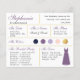 Um cartão de informações de madrinha para um casamento roxo e dourado, incluindo informações sobre a data e local do casamento, as cores do casamento, o grupo da noiva, o vestido de madrinha e uma mensagem de proposta de madrinha. O nome da madrinha e os títulos são escritos em uma caligrafia elegante roxa empoeirada. No canto inferior direito, há um vestido roxo empoeirado. No centro, estão as cores do casamento em círculos. As cores, incluindo a cor do vestido de noiva, podem ser alteradas, com exceção do círculo dourado, que é de falso foil dourado. As cores padrão são azul-marinho, roxo empoeirado, lavanda (roxo claro), rosa bege e dourado. A parte de trás é roxa empoeirada, como a cor do vestido de madrinha.