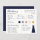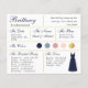 Um cartão de informação de marinho azul e dourado, incluindo informações sobre a data e a localização do casamento, as cores do casamento, a festa noiva, o vestido de dama de honra e uma mensagem de proposta de dama de honra. O nome da madrinha e os títulos estão escritos em um roteiro elegante azul-marinho. No canto inferior direito, há um vestido azul marinho. No centro, há as cores do casamento em círculos. As cores, incluindo a cor do vestido de noiva, podem ser alteradas, com exceção do círculo dourado, que é a folha de ouro falsa. As cores padrão são azul marinho, azul empoeirado, rosa empoeirado, rosa-pincel e ouro.
