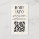 Ponha o tom para um casamento moderno onde todos os convidados vestem preto e branco, a recepção está em um clube de jazz com deco de arte, falem vibrações fáceis, e todos bebem Negronis e martinis secos enquanto balançavam a música de uma banda de jazz. Esta placa de gabinete de informações de tamanho cartão de visita serve uma variedade de propósitos com um código de QR digitalizável para direcionar os convidados para o site de sua escolha, onde eles podem enviar um RSVP digital, reservar um hotel ou baixar um itinerário de eventos.