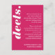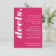 Nosso cartão de cerimônia de noivado, estilo retrógrado, é perfeito para o casal da moda que ama se destacar e fazer uma declaração ousada. Combinação de cor rosa-magenta brilhante e robusta. Design simples e mínimo cria uma aparência ousada com "Deets". Ela é exibida ousadamente em caracteres brancos grandes. O verso apresenta um simples design moderno, com um monograma ousado e um endereço opcional do site de casamento do casal. Projetado por Papelaria de Moodthologia