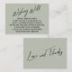 Essas simples e distintas inserções de cartão foram projetadas para combinar outros itens em um pacote de eventos em crescimento que apresenta uma fonte moderna de escrita manual casual sobre um plano de fundo comum que você pode mudar para qualquer cor que quiser. No lado frontal você lê "Wishing Well" no tipo em destaque; no verso eu coloquei um "Love and Obrigados" correspondente. O tipo editável é renderizado em todos os bonés, serif typeface. A mensagem do titular do meu lugar diz "O mais importante é tê-lo conosco no nosso dia especial. Não são necessários nem esperados presentes, mas perguntaram-nos o que é que precisamos ou gostaríamos. Se você quer nos dar algo, um pouco de dinheiro para gastar em nossa lua de mel seria muito apreciado." Sinta-se livre para usar os campos de modelo e edite esta cópia com sua própria mensagem pessoal para tornar esses cartões seus. 151 //
