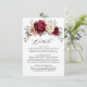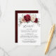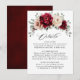 Cartão de detalhes de casamento com tema floral elegante em vermelho borgonha, champanhe, marfim e tons terrosos, apresentando um buquê elegante de rosas, peônias em cores borgonha e champanhe marfim e folhas de eucalipto em verde sálvia. Por favor, entre em contato comigo para qualquer ajuda na personalização ou se você precisar de qualquer outro produto com este design.