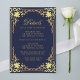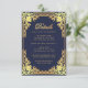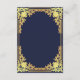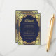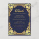 Este cartão de recinto de casamento azul-marinho, elegante, com um ar vintage, tem uma moldura dourada vintage com decorações barrocas em falso ouro sobre um fundo azul-marinho. O título Detalhes é escrito em falso ouro, em uma fonte caligráfica elegante. Todo o texto tem uma cor dourada semelhante às decorações douradas das bordas. Você pode incluir detalhes sobre o recebimento, acomodações, direções, lista de presentes, site do casamento e mais.