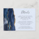 A borda esquerda deste cartão de detalhes de casamento moderno e elegante apresenta uma borda de ágata em azul marinho com acabamento em glitter dourado falso. O título aparece em escrita à mão, com texto personalizável abaixo em fonte copperplate cinza carvão em um fundo azul claro. O verso apresenta um design de ágata azul marinho e dourado correspondente.
