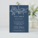 Cartões de detalhes de casamento florais elegantes com flores e folhas brancas desenhadas perto do topo do design com um fundo azul-marinho. Personalize os cartões de detalhes de casamento botânicos com os detalhes do seu casamento abaixo em letras brancas clássicas. Projetados para combinar com nossa coleção de casamento Florais Desenhados.