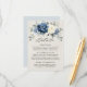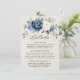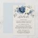 Cartão de detalhes de casamento com buquê floral azul poeira apresentando um elegante buquê de azul marinho, azul real, branco, dourado, champanhe marfim, rosa cor-de-rosa desbotado, botões de ranúnculo e folhas de eucalipto verde-sage e buquê de aquarela elegante. Por favor, entre em contato comigo para qualquer ajuda na personalização ou se você precisar de qualquer outro produto com este design.