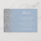 A borda esquerda deste cartão de detalhes de casamento moderno e elegante apresenta um design de brilho falso prateado. O texto personalizável combina caligrafia branca e fontes copperplate em um fundo azul desbotado. O verso apresenta um design correspondente de azul desbotado e brilho prateado.