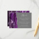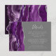 A borda esquerda deste elegante cartão de detalhes de casamento moderno apresenta uma cor d'água púrpura e borda agitada com falso brilho prateado. O título aparece no script de escrita manual, com texto personalizável abaixo na fonte da placa de reprodução da cinza prateada em um plano de fundo de cinza médio. O verso apresenta um design de agata prateado e roxo correspondente.