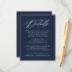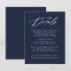 Nossa coleção de casamento Elegante da Caligrafia apresenta um belo roteiro de caligrafia branca com marinho de fundo. Personalize este cartão de cerimônia de casamento com detalhes importantes como acomodações de hotel, site de casamento, arranjos de viagem, recepções de boas-vindas e muito mais. O cartão de detalhes do casamento do marinho escuro é perfeito para casamentos formais e casuais de qualquer época.