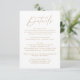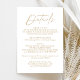 Cartão de identidade simples e elegante com um guião dourado manuscrito misturado com letras modernas, em fundo branco. Personalize o cartão de detalhes do casamento minimalista com seus detalhes de casamento, como informações de recepção, acomodações de hotel, site de casamento, etc. O cartão de detalhes do casamento dourado é perfeito para casamentos modernos.