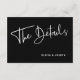 Esses cartões de informações de convidados de casamento, preto e branco, modernos apresentam uma tendência e estilo elegante, com roteiro casual manuscrito e texto clássico. Você pode usar esses cartões para dirigir, receber ou transportar informações, informações sobre hotel ou acomodações e quaisquer outros detalhes de casamento que você precise conhecer. A parte traseira da placa é preta com mais caligrafia branca.