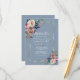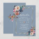 Desenho elegante com buquês florais em aquarela de rosa enevoada e azul poeirento delicados, moldura dourada falsa, divisor floral lindo, em um fundo azul poeirento. Use a ferramenta Personalizar para adicionar suas informações e alterar as cores das fontes. Para itens correspondentes, visite minha Coleção de Flores Azuis Poeirentas Douradas.
