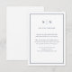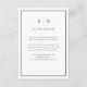 Estes elegantes e modernos cartões de convidados de casamento apresentam um simples design de texto minimalista azul e branco com suas iniciais ou monograma e um clássico quadro azul escuro. Você pode usar esses cartões para dirigir, receber ou transportar informações, informações sobre hotel ou acomodações e quaisquer outros detalhes de casamento que você precise conhecer.
