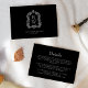 Este elegante cartão de detalhes do casamento moderno apresenta um texto branco clássico sobre um fundo preto. Na parte de trás do cartão, uma crista branca vintage foliage rodeia as iniciais do monograma do casal, com os seus nomes e a data de casamento abaixo.