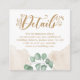 Este cartão de detalhes do casamento com código QR de folhagem dourada é perfeito para um casamento boho. O design elegante, mas rústico, apresenta folhas escuras de aquarela e eucalipto com um toque moderno da floresta boêmia.