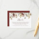 Nosso cartão de detalhes de casamento com ilustrações em aquarela de Bordeaux oferece uma maneira bonita e refinada de transmitir todos os detalhes essenciais do seu casamento. Apresentando flores suaves em aquarela no topo, combina caligrafia moderna e elegante com letras sofisticadas em um fundo branco crocante. Totalmente personalizável com as informações do seu casamento, este cartão garante que seus convidados tenham tudo o que precisam para o grande dia. Um retângulo Bordeaux em negrito na parte inferior adiciona um toque de sofisticação e cor rica. Combinando elegância e funcionalidade, este cartão é o complemento perfeito para qualquer casamento romântico ou com tema floral.