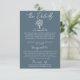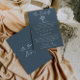 Informações simples e elegantes para convidados do casamento com flores azuis marinho e brancas. Com um fundo azul simples e layout de texto branco. E buquê floral desenhado à mão. Todas as informações são personalizáveis como site, transporte e acomodação. Adquira-o junto com outros produtos deste kit de casamento retrô feito à mão.