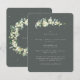 Um cartão de envelope de casamento plano verde cinza escuro apresentando um caule elegante de snowberries pintadas à mão e eucalipto na frente e uma coroa na parte de trás do cartão. Todo o texto é totalmente editável e os pontos espalhados na frente e no verso podem ser excluídos antes de encomendar, se preferir. Este cartão está disponível com desenhos botânicos alternativos, em formato paisagem e em cores diferentes. Por favor, visualize a Coleção na minha loja para ver todas as opções e itens coordenados.