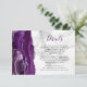 A borda esquerda deste elegante cartão de detalhes de casamento moderno apresenta uma cor d'água púrpura e borda agitada com falso brilho prateado. O título aparece em um script de escrita manual púrpura escura, com texto personalizável abaixo na fonte da placa de impressão preta em uma cinza e fundo de mármore branco. O verso apresenta um design de agata prateado e roxo correspondente.