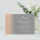 A borda esquerda deste elegante e moderno cartão de detalhes de casamento contém um design brilhante falso de pêssego. O texto personalizável combina manuscrito branco, fontes em copperplate e itálico em um fundo de cinza. O verso apresenta um design de brilho de pêssego correspondente.