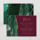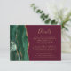 A borda esquerda deste elegante e moderno cartão de detalhes de casamento contém uma esmeralda verde aquarela agate borda aparada com falso brilho dourado. O texto está em um guião de escrita manual dourada e um tipo de letra de impressão em fundo burgundy. O verso apresenta um design verde e dourado correspondente.