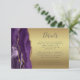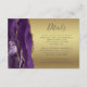 A borda esquerda deste elegante cartão de detalhes de casamento moderno apresenta uma borda de agitação de cor d'água roxa, aparada com falso brilho dourado. O título aparece em script de escrita manual, com texto personalizável abaixo na fonte da placa da cinza de carvão em um fundo de folha falsa em ouro de vidro. O verso apresenta um design de agate roxo e dourado correspondente.
