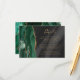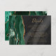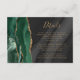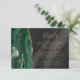 A borda esquerda deste elegante e moderno cartão de detalhes de casamento contém uma esmeralda verde aquarela agate borda aparada com falso brilho dourado. O texto está em um script de manuscrito dourado e uma fonte em copperplate em um fundo de aquarela preta. O verso apresenta um design verde e dourado correspondente.