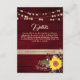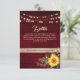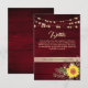 Cartão de detalhes de casamento rústico, country elegante, com madeira em burgundy, site, girassol, renda floral em dourado vintage e luzes de corda.