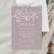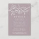 O Elegante casamento floral detalha cartões com flores brancas esboçadas e folhas perto do topo do design com fundo roxo empoeirado. Personalize os cartões de detalhes do casamento botânico com os detalhes do casamento abaixo em letras brancas clássicas. Projetado para coordenar com a nossa coleção de casamento Floral.