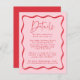 Preencha sua suíte de casamento com nosso cartão de casamento do Modern Pink e do Red Wavy Frame. Apresentando o mesmo design que a nossa coleção de convites, este cartão apresenta uma fronteira vermelha de moldura ondulada em torno de seus importantes detalhes de casamento, como detalhes do local de casamento, acomodações de hotel, instruções e site de casamento em um fundo rosa.