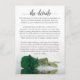 Este belo cartão de cercado de casamento foi projetado para lhe dar espaço extra para qualquer informação que seus hóspedes precisem, incluindo site, registro, recepção, viagem, acomodações ou qualquer outro detalhe. O cartão apresenta um design maravilhoso com um solteiro refletindo um rosa de cor verde esmeralda esmeralda e um título de caligrafia lacy que lê "os detalhes". A parte de trás é uma esmeralda profunda marmoreada ou uma cor verde da floresta.