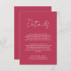 Este cartão de cerimônia de detalhes do casamento é a maneira perfeita de compartilhar todos os detalhes do seu casamento em estilo. O design mínimo apresenta uma tipografia elegante num fundo viva magenta, fazer-o como uma bela adição ao seu dia especial. Este cartão personalizável fornece todas as informações de que seus convidados precisarão, incluindo acomodações, transporte e seu site de casamento. O design simples pode ser personalizado em qualquer cor, permitindo que você crie um toque personalizado para o seu grande dia. Com sua sofisticação e versatilidade, este cartão de cerimônia de detalhes do casamento é a escolha perfeita para a na moda e noiva e noivo modernos.