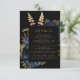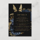 Este elegante cartão de detalhes de casamento, moody, apresenta um buquê floral romântico, luxuoso, em azul marinho, com folha falsa de ouro e folhagem brilhante sobre fundo preto. Personalize o texto dourado em fontes na moda em um retângulo preto. A parte traseira da placa é preta e sólida.