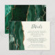 A borda esquerda deste cartão de detalhes do casamento moderno e elegante apresenta uma borda de ágata em aquarela verde esmeralda aparada com brilho dourado falso. O texto está em script de caligrafia verde esmeralda e fonte copperplate em um fundo marfim. O verso apresenta um design de ágata verde e dourado correspondente.