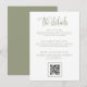 Este cartão de detalhes do envelope, elegantemente projetado, complementa perfeitamente o seu conjunto de casamento com sua paleta de cores verde-sage e branco na moda. Com uma fonte de caligrafia manuscrita para o cabeçalho, traz elegância simples para a sua papelaria. O layout minimalista moderno oferece seções claramente definidas para informações importantes, como detalhes da recepção, acomodações e detalhes específicos do evento - ou você pode personalizar os títulos de acordo com as suas necessidades. Personalize facilmente este modelo com todos os detalhes importantes do seu casamento, incluindo o URL do seu site de casamento, garantindo que os convidados tenham tudo o que precisam em um cartão lindamente elaborado. © Kimbellished, LLC