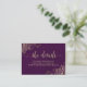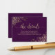 Este belo cartão de acompanhamento foi projetado para fornecer aos seus convidados um URL de site ou página da web onde eles podem obter informações adicionais sobre o recebimento, acomodações, arranjos de viagem, registro, site, direções ou quaisquer outras especificidades que seus convidados possam precisar. Apresenta um design simples, mas elegante, em roxo com um título em letra cursiva elegante e cachos e espirais dourados de falso folheado a ouro nos cantos.