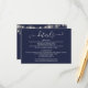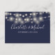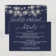 Um cartão de informações de detalhes do casamento em azul marinho elegante com lindas luzes de corda. Personalize com seus detalhes especiais em tipografia elegante e seus nomes e data do casamento no verso. Desenhado por Thisisnotme