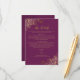 Esta bela placa de gabinete foi projetada para fornecer aos seus convidados informações adicionais sobre recepção, acomodações, arranjos de viagem, registro, site, instruções ou quaisquer outras especificações que os seus convidados possam exigir. Possui um design simples, mas elegante, com texto dourado em um fundo roxo ou magenta do gabinete, um título de script antigo, e caramujos e espirais friamente prateados nos cantos.