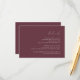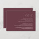 Este simples e elegante cartão de detalhes do casamento contém texto branco alinhado com a margem direita em um fundo burgundy escuro. A palavra "detalhes" aparece no script caligráfico, com texto personalizável em itálico abaixo. A parte de trás do cartão é uma arma sólida.