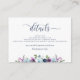 Cartão de compartimento "Detalhes" elegante com borda floral de cor d'água delicada em matizes azuis, violetas e roxas. Elementos modernos de caligrafia escrita à mão. Capacidade de adicionar quaisquer detalhes que você quiser, do site de casamento, instruções de recepção, acomodações, registro, traje ou qualquer outra coisa que você quiser. Parte da nossa coleção "Blossomas Roxos e Azuis" com uma variedade de produtos de coordenação disponíveis. Visite a coleção inteira em: https://www.zazzle.com/collections/purple_and_blue_blossoms_collection-119752419948427787