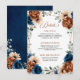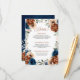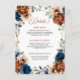 Cartão de detalhes de casamento com tema floral terroso laranja, azul marinho elegante, apresentando um buquê elegante de rosas azul marinho, peônias cor de terracota e folhas de eucalipto verde. Entre em contato para ajuda na personalização ou se precisar de outro produto com este design.