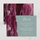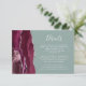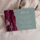 A borda esquerda deste elegante cartão de detalhes do casamento moderno apresenta uma borda de cor-d-água borrifada, aparada com falso brilho prateado. O texto está em um script branco de escrita manual e um tipo de letra copperplate em um fundo verde de sábio. O lado inverso apresenta um design de burgundy e agate prateado.