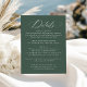 Este cartão de detalhes do casamento de na moda apresenta elegante caligrafia branca com ortografia "Detalhes" contra um fundo verde-escuro rico. Personalize-o com seus detalhes essenciais de casamento, incluindo informações de recepção, acomodações de hotel e seu site de casamento, tudo em letras brancas em negrito. A design moderna, simples e elegante é ideal para casamentos formais e casuais, fazer que seja uma escolha versátil para qualquer estação. Perfeito para manter seus convidados informados enquanto adiciona um toque sofisticado à sua papelaria de casamento, este cartão oferece função e beleza para seu dia especial.