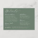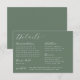 Imprima seus convidados com esta elegante carta formal de detalhes do casamento de JessicaAmber. Este cartão clássico apresenta letras brancas sobre um fundo verde sábio e exibe os seguintes detalhes do casamento: Acomodação, Crianças, Código de Vestido, Janto e site. Procure na minha coleção o conjunto de convites correspondente. Para obter mais artigos de papelaria de casamento verdes, visite minha loja Zazzle.com/EventsByJessicaAmber ・ ・ ・ Para pedidos personalizados, envie-me uma mensagem no Zazzle