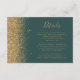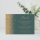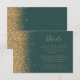 A borda esquerda deste elegante cartão de detalhes de casamento moderno apresenta um design dourado faux glitter. O texto personalizável combina manuscritos dourados, copperplate e fontes itálicas em um fundo verde escuro. O verso apresenta um design brilhante verde e dourado.