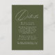 Cartões de cerimônia simples e elegantes, com "Detalhes" em um roteiro branco de caligrafia moderna, com um fundo verde-oliva sólido (ou cor de sua escolha). Personalize os cartões de cercado minimalistas adicionando seus detalhes de casamento em letras brancas. Projetado para coordenar com a nossa coleção de casamento do Modern Elegance.
