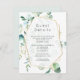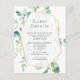Cartões de detalhes do convidado de casamento com moldura geométrica dourada e tipografia elegante personalizáveis para os detalhes do seu evento, com eucalipto florestal trendy em aquarela.