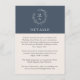 Uma escolha saborosa e clássica em cartões de cerimônia de detalhes do casamento, esta design transmite uma elegância simples em seu layout de texto e estilo clássico. Uma simples coroa aberta de folhas esboçadas envolve o monograma inicial da noiva e do noivo. O elegante e simples modelo de texto tem um modelo de texto de exemplo para personalizar com as informações desejadas. Você pode incluir acomodações de hotel disponíveis para seus convidados, seu site de casamento, eventos especiais, informações de transporte ou quaisquer detalhes que você queira fornecer aos seus convidados. Ele está disponível em diversas cores populares (mostradas aqui no verde e na náutica de grande senso), assim como em vários tipos de papel e pesos diferentes.